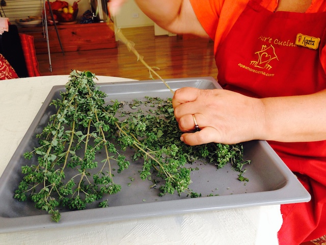 Get someone tall to bring it down from where it is hanging (if it’s out of reach) and place the dried bunch of oregano on a cloth or a tray. It is easier to contain it in a tray and at the end to pick it up and pour into a jar.