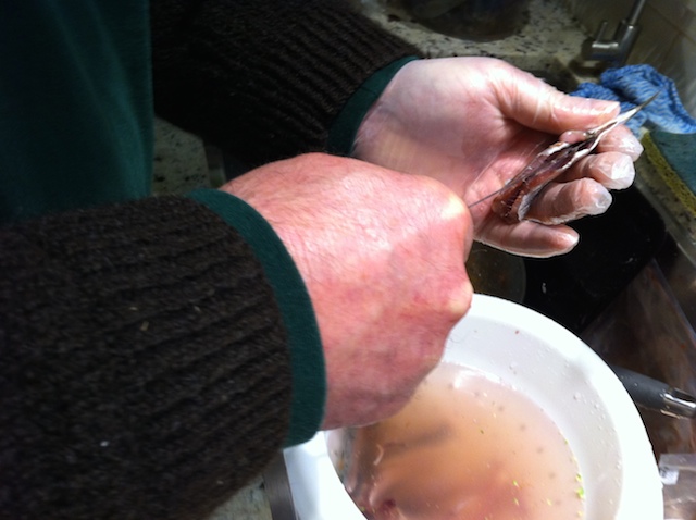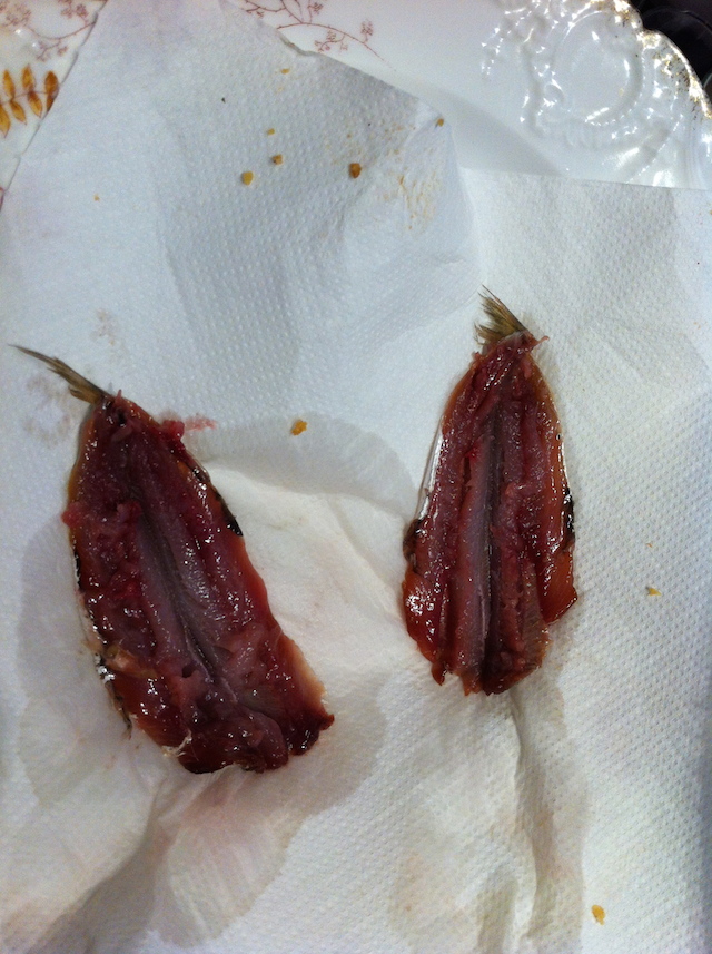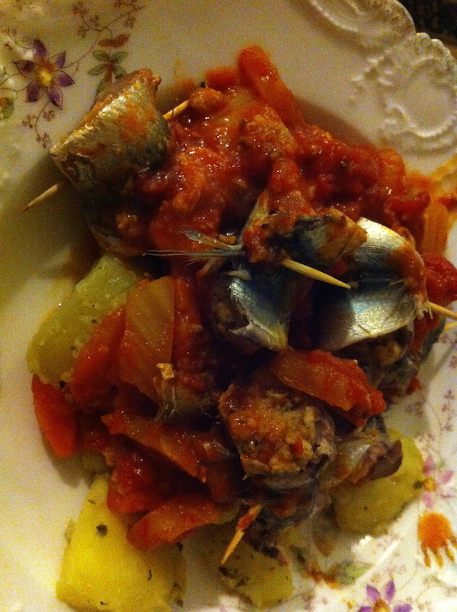 By the time the sauce is ready, the sardines have been cleaned, cut and stuffed.