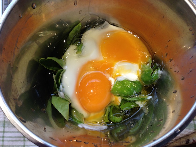 In a food processor (or jug for a stick blender) blend the basil, eggs, yogurt, honey, sunflower seeds with the extra virgin olive oil.